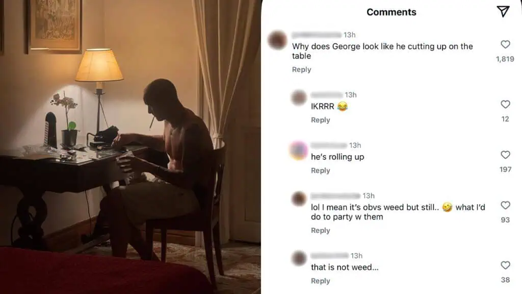 But then came that photo. George Daniel, shirtless at a desk, a joint dangling from his mouth like a prop from an A24 film. In one hand? A giant plastic bag that suspiciously resembled weed. In the other? Fingers hovering over the table in a way that looked just a little too much like… cutting lines. Cue the collective gasp.