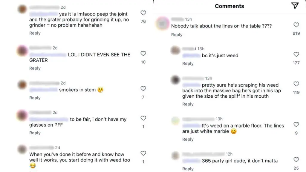 Fans flooded the comments faster than you can say “honeymoon high.” – “Nobody talk about the lines on the table???” one follower wrote. Another chimed in: “Bro looks like he cutting up on the table.” Defenders jumped in too, insisting it was “just weed” and even pointing out the joint already hanging from his lips.