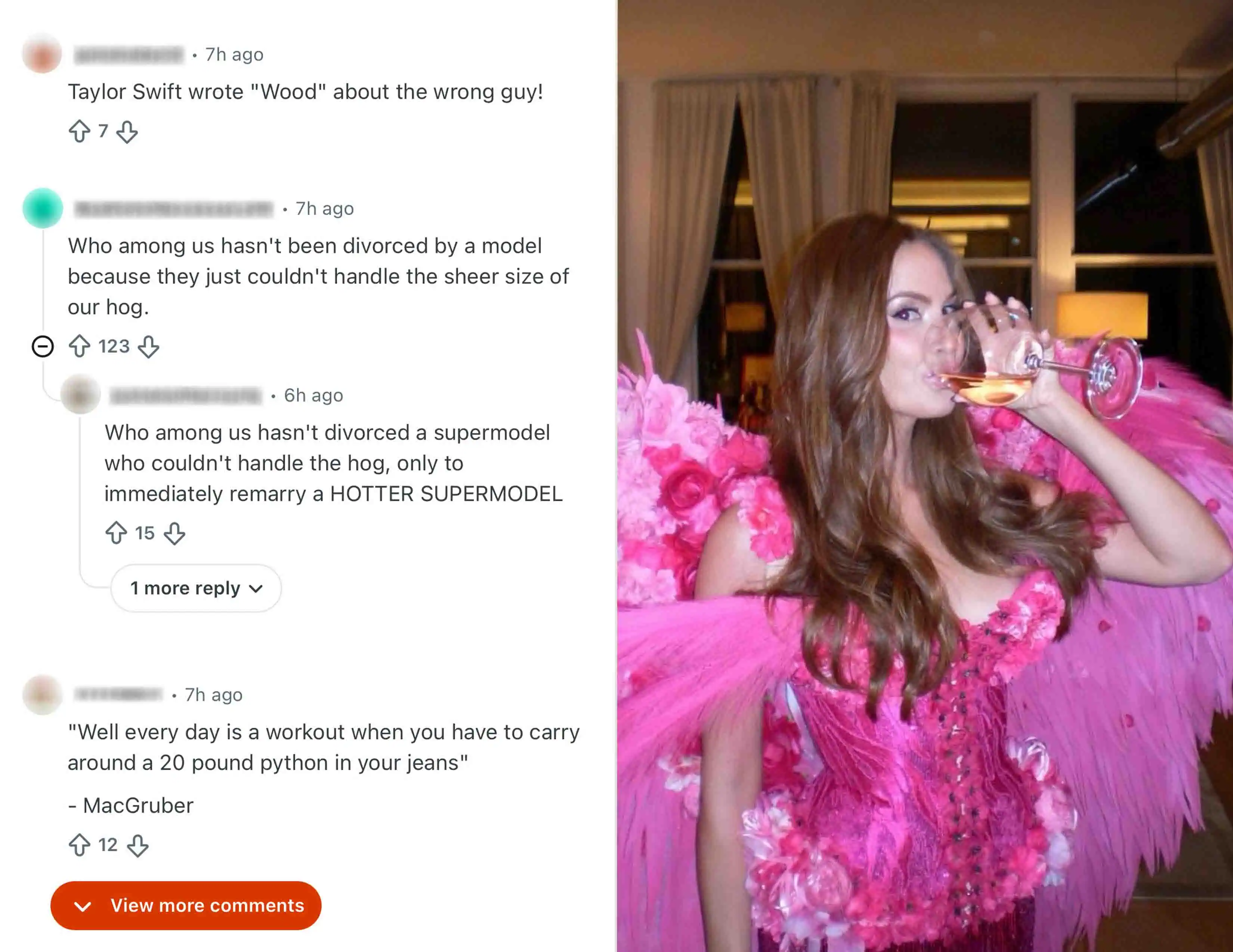 From “Taylor Swift wrote ‘Wood’ about the wrong guy” to “Who among us hasn’t been divorced by a model who couldn’t handle the hog?” — the comments dripped with disbelief and brutal sarcasm.