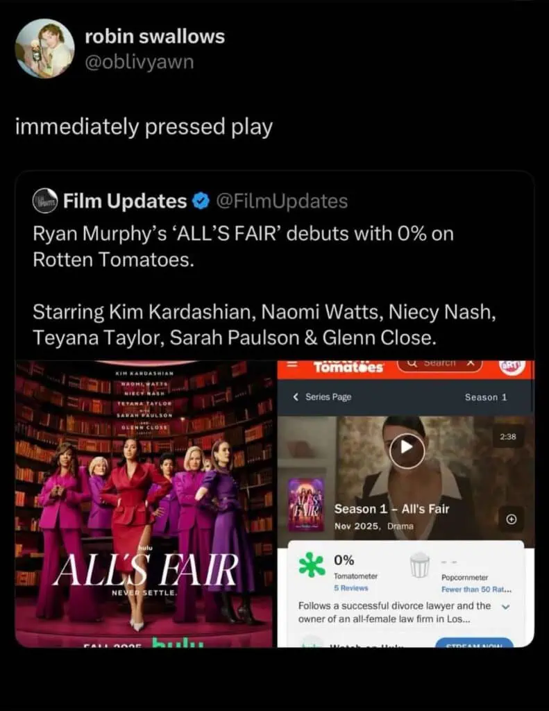 The same week Kim’s bar results surfaced, All’s Fair, her new courtroom drama on Hulu, debuted to a brutal 0 percent on Rotten Tomatoes and quickly became a full-blown hate watch.